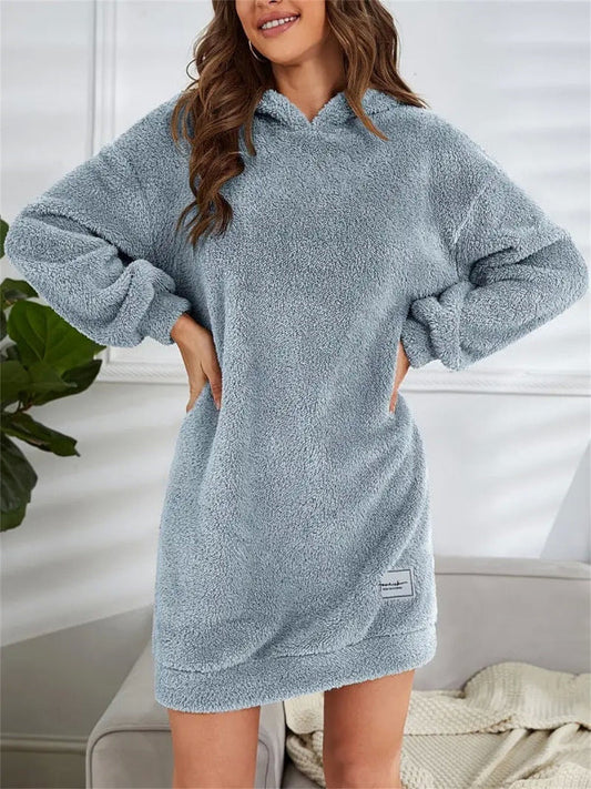 50% KortingZachte Oversized Teddy Sweater Jurk met Hoodie