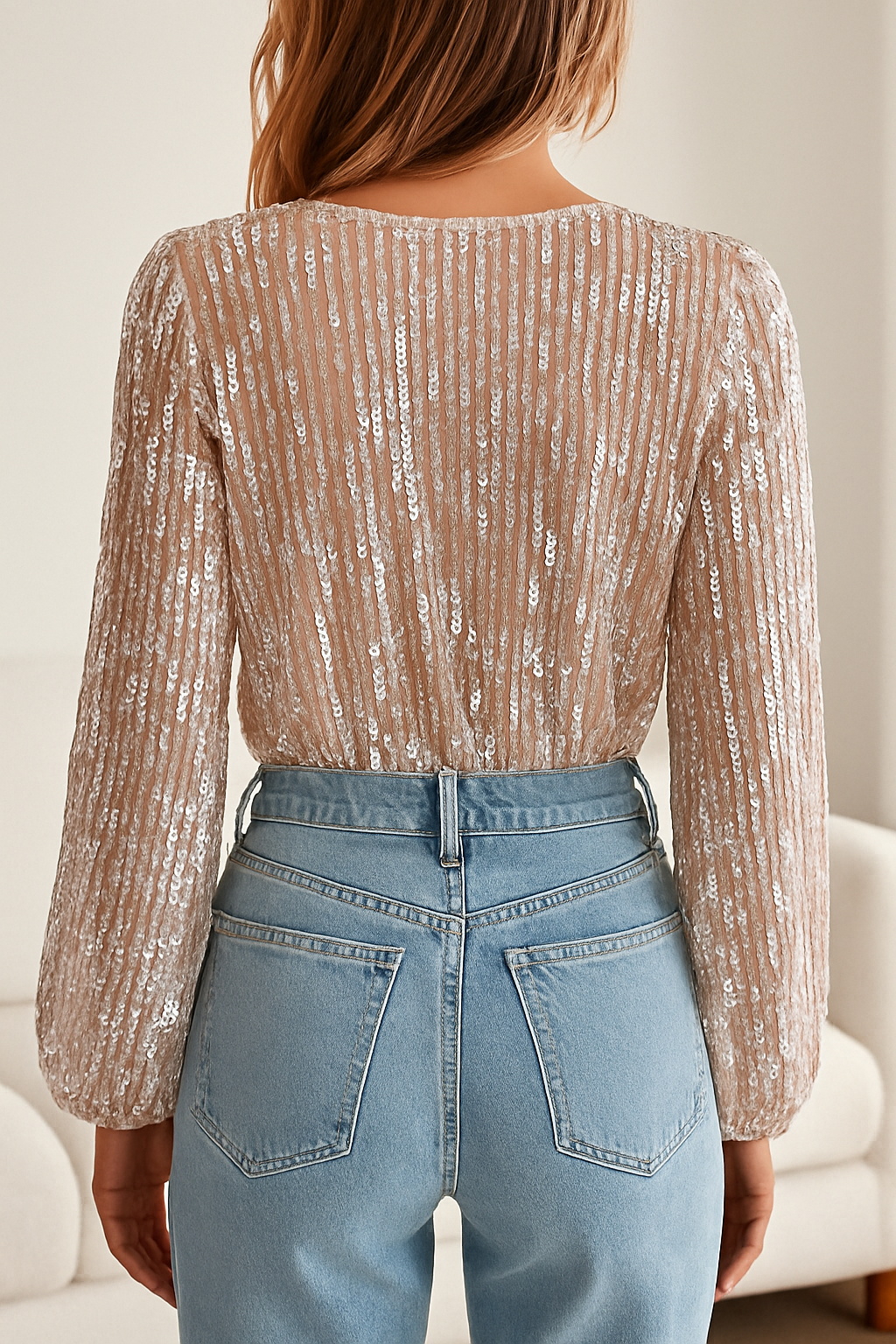 De Dylan Luxe Pailletten Blouse is de ultieme eyecatcher voor feestelijke gelegenheden. Deze schitterende blouse, uitgevoerd in een elegante champagnekleur met glinsterende pailletten, straalt luxe en glamour uit. De diepe V-hals en losvallende pasvorm maken het een perfecte keuze voor een avond vol stijl en elegantie.