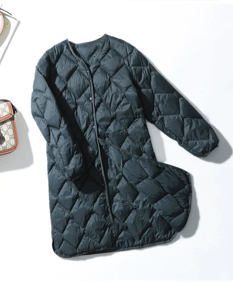 Blijf warm en stijlvol in deze elegante gewatteerde jas met een moderne lange pasvorm. De subtiele diamantstiksels geven een verfijnde look, terwijl de rits zorgt voor praktisch gemak.
