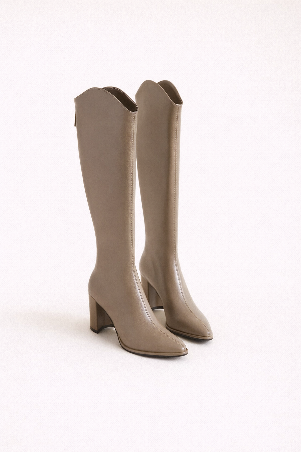 - Pasvorm: Slanke, elegante kniehoge pasvorm met comfortabele blokhak