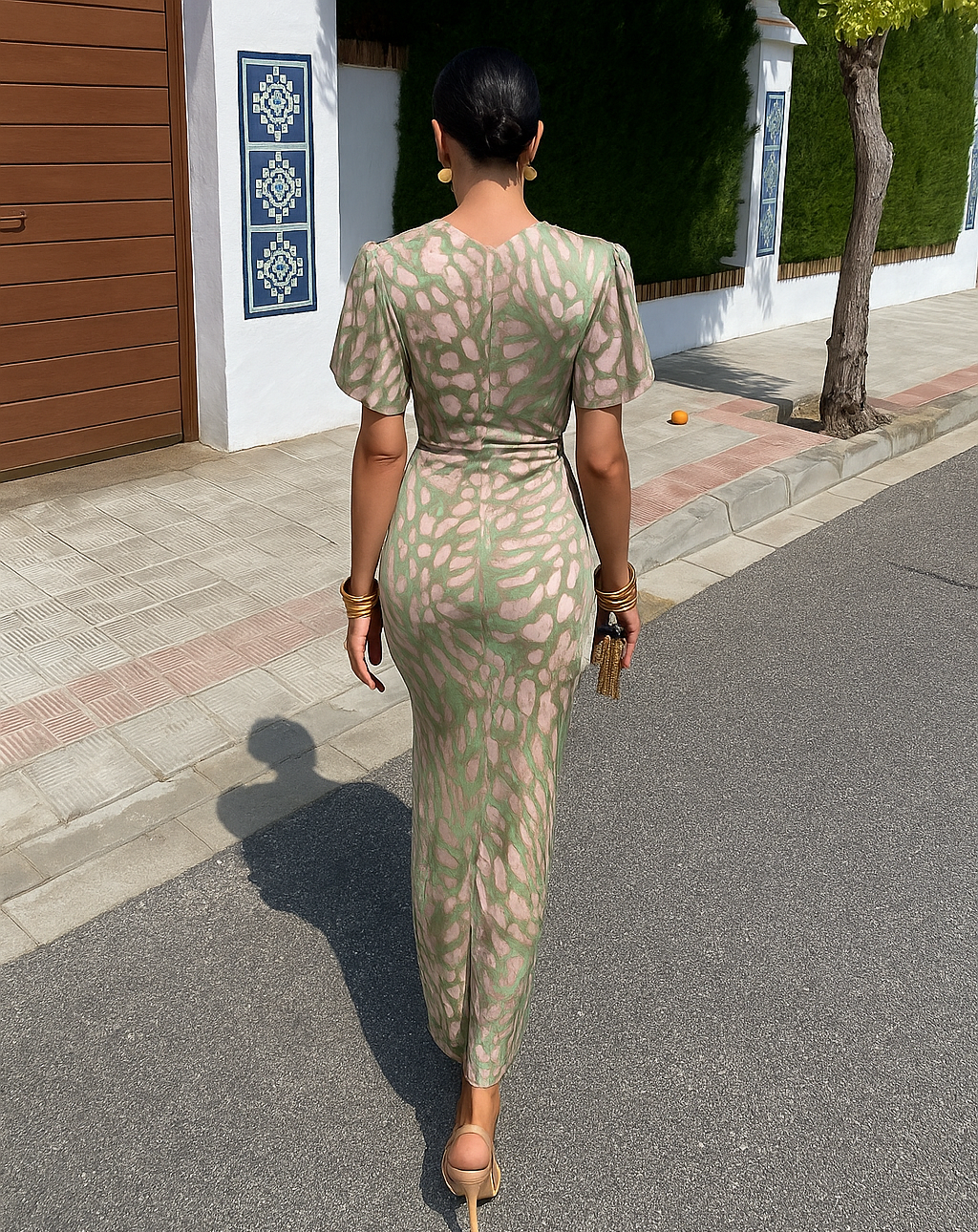 Onze Ravena Midi Dress is de perfecte keuze voor een verfijnde en modieuze uitstraling. Deze jurk in een zachte groene tint met subtiele bloemenpatronen biedt een elegante en flatterende pasvorm. Het twist-front ontwerp creëert een verfijnde uitstraling die je figuur prachtig accentueert, perfect voor chique gelegenheden of een avond uit.