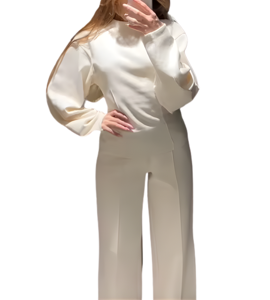 Deze set is veelzijdig genoeg voor thuis, casual uitstapjes of zelfs een relaxte kantoordag. De getailleerde top zorgt voor een flatterende pasvorm, terwijl de broek met wijde pijpen soepel meebeweegt voor extra comfort. Tweedelige set met verfijnde naden en subtiele structuur voor een luxe afwerking. Combineer de set met sneakers voor een ontspannen look of met laarzen voor een meer geklede uitstraling.